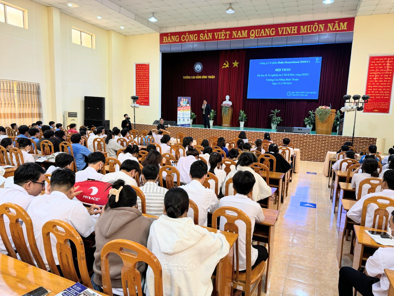 Từ ngày 23 - 27/9/2024, Trường Cao đẳng Bình Thuận (BTC)phối hợp với Công ty Cổ phần Hallo Deutschland (HDEU) tổ chức chuỗi các hoạt động tư vấn tuyển sinh tại các cơ sở 1, 2, và 3 của Trường, trọng tâm là hoạt động gặp gỡ, tư vấn trực tiếp cho sinh viên khối ngành chăm sóc sức khỏe, kỹ thuật và du lịch. Song song với hoạt động tư vấn trực tiếp tại lớp học dành cho sinh viên năm 2 và 3, chương trình hội thảo tư vấn du học 3+1 “Học tại Cao đẳng Bình Thuận, làm việc tại CHLB Đức” cho sinh viên năm nhất cũng diễn rất sôi nổi.
