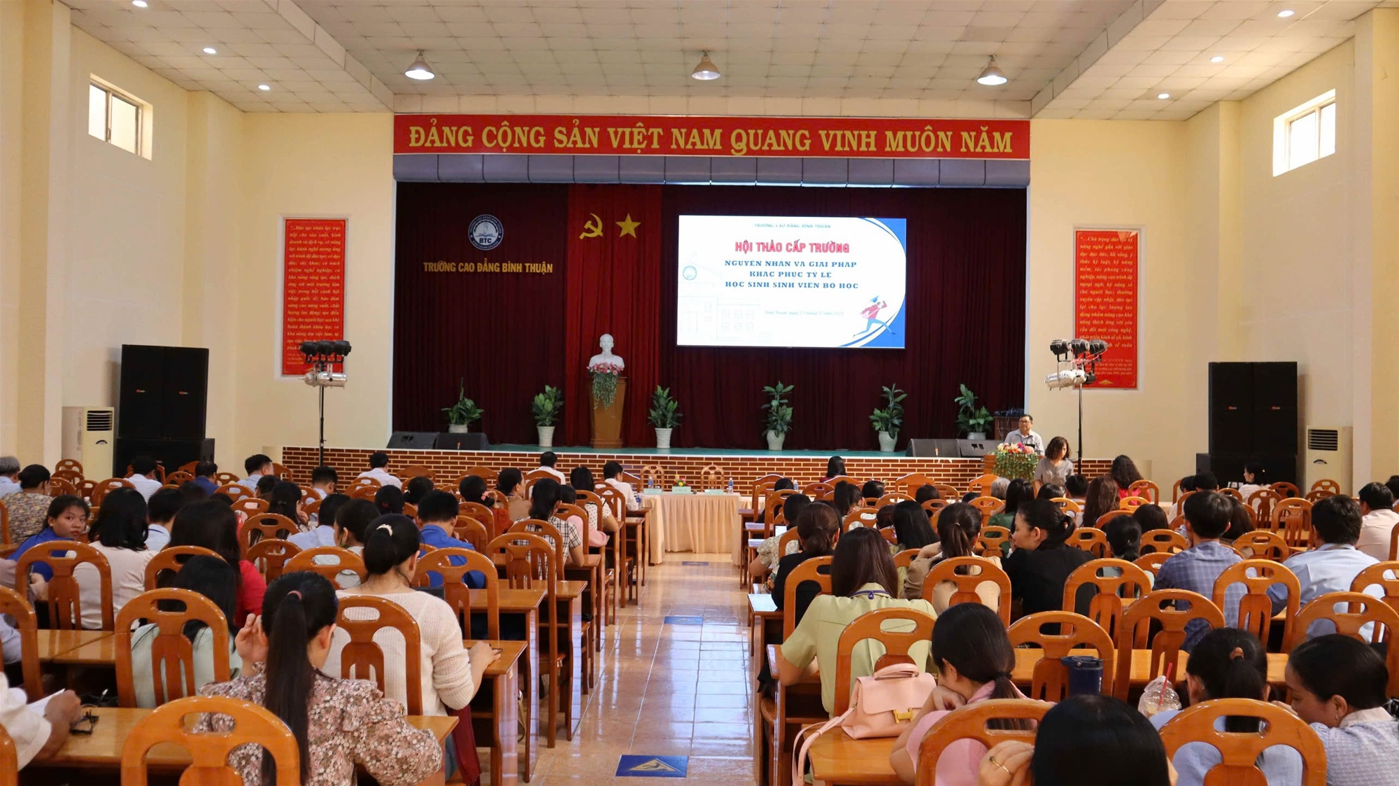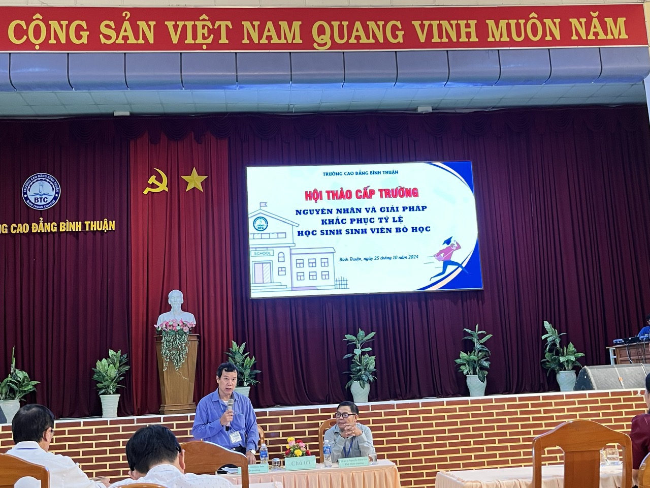 Chiều ngày 25/10/2024, tại Hội trường Cơ sở 1, Trường Cao đẳng Bình Thuận đã tổ chức Hội thảo “Nguyên nhân và giải pháp khắc phục tỷ lệ học sinh, sinh viên bỏ học” với sự tham dự của Ban Giám hiệu nhà trường và hơn 120 viên chức, nhà giáo đến từ các phòng, khoa thuộc Trường.
